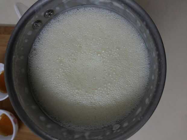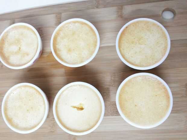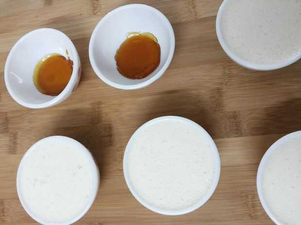 4. Vierta la mezcla sobre el caramelo enfriado en los moldes de flan.