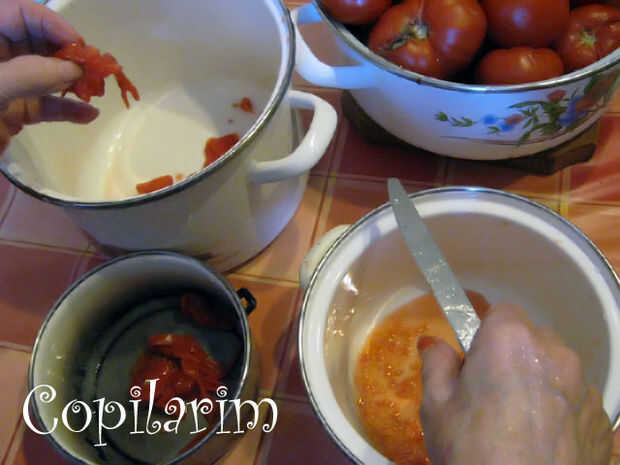 -ponemos la parte de la semilla y la piel que tiene algo de fruta en un recipiente aparte (para el jugo que va a ser utilizado en sopas) - como en la imagen de abajo