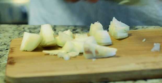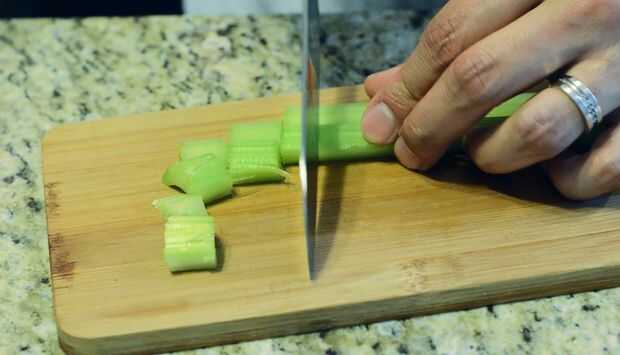 2. Cortar media cebolla, tallo de un apio y una zanahoria en cubos pequeños.