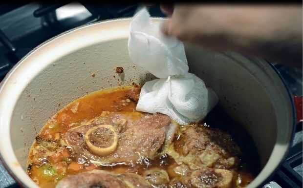 1. Después de agregar el caldo de pollo, preparar el bouquet garni.