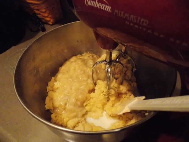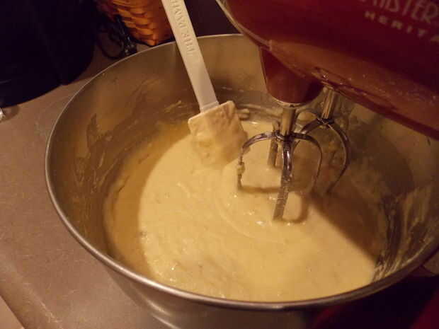 Añadir la leche y el puré de plátanos a la mezcla y mezclar hasta que quede lisa. Recuerde usar el raspador de goma para quitar la masa desde el lado del tazón de fuente.