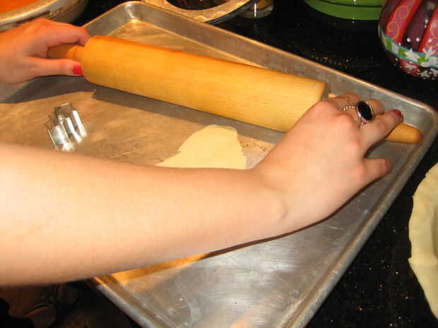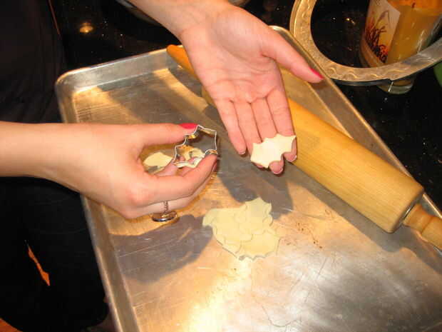 Estirar la masa de la corteza de pastel extra y cortador de galletas (por ejemplo, una hoja) para cortar una forma festiva para poner encima de la tarta.