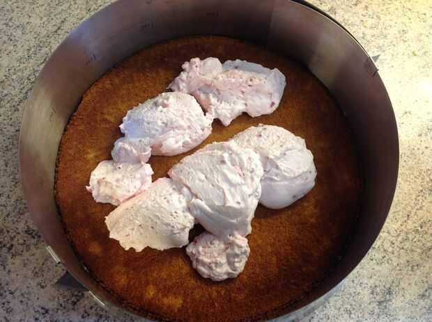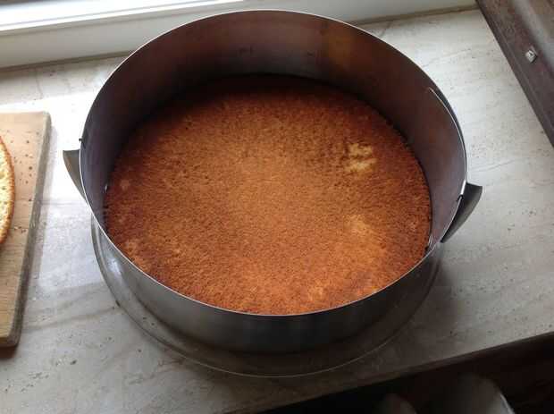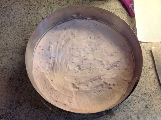 Cuando el pastel se haya enfriado, tomar la parte superior de la misma y colóquela en un plato bonito. Luego, tome un anillo de la torta (como se ve en la imagen) y colocar alrededor de la torta. Esto ayudará a ninguno de la crema para ir a cualquier parte, excepto en su torta.