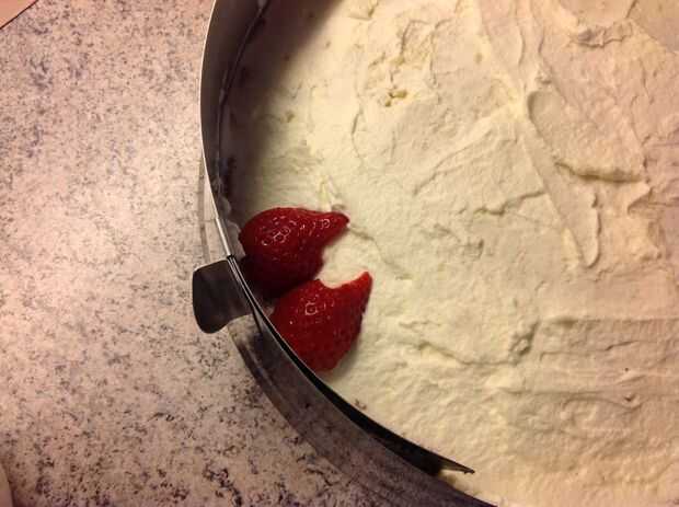 Coge las fresas lavadas y cortadas por la mitad. Tomar las mitades y colocarlos sobre la tarta en un formato circular.