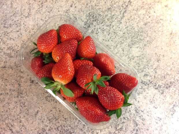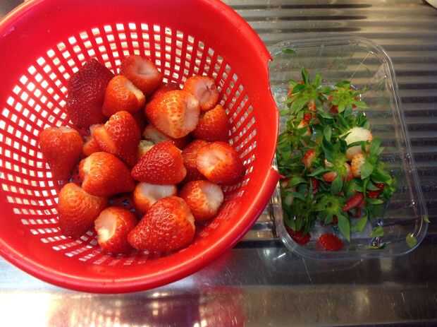 El siguiente paso es cortar las partes verdes de las fresas. Prueba corte estrechamente alrededor de la pieza verde, para que no corte apaga demasiado de la fresa. Una vez que ha hecho esto, lave bien las fresas.