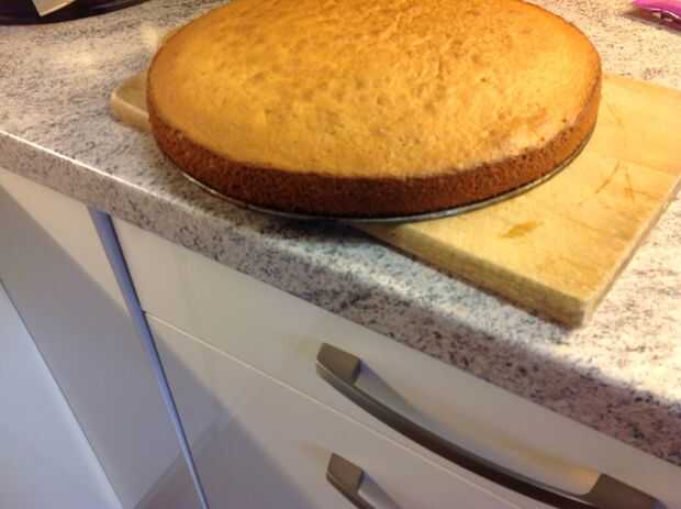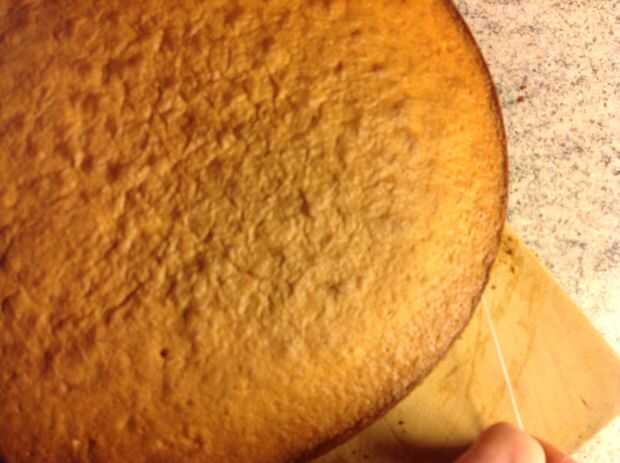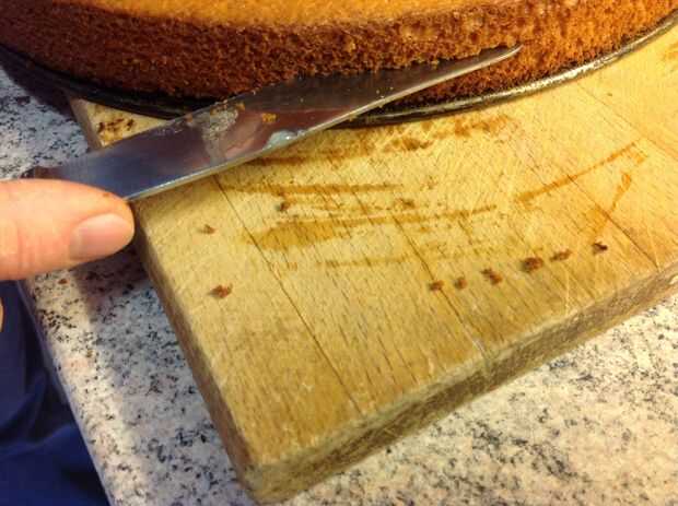 Una vez que el pastel se haya enfriado un poco, cortar en el lado de la torta con un cuchillo. Ir alrededor de la torta en un movimiento circular. Una vez han hecho eso, Búscate alguna cadena y colocarlo donde usted corta el pastel. Páselo a través de la torta con un movimiento lento y cuidadoso, por lo que no rompe nada. Esta manera, estamos creando dos tortas.