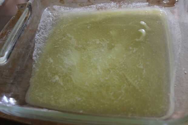 Derretir la manteca 8 cucharadas en el fondo del vidrio de 9 x 9 para hornear