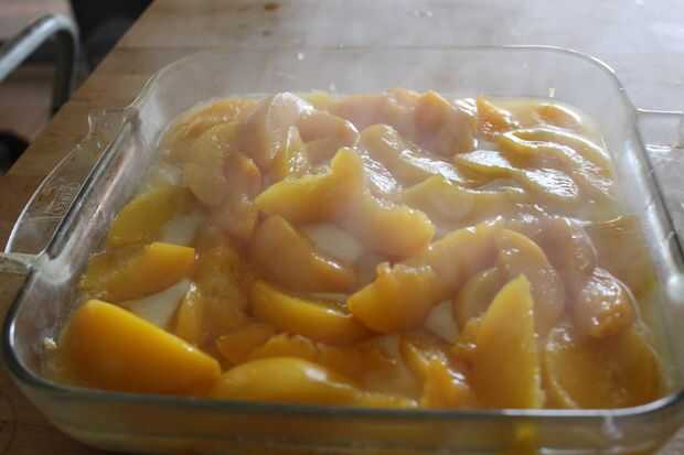 Colocar los melocotones encima la mezcla de harina/leche/azúcar.