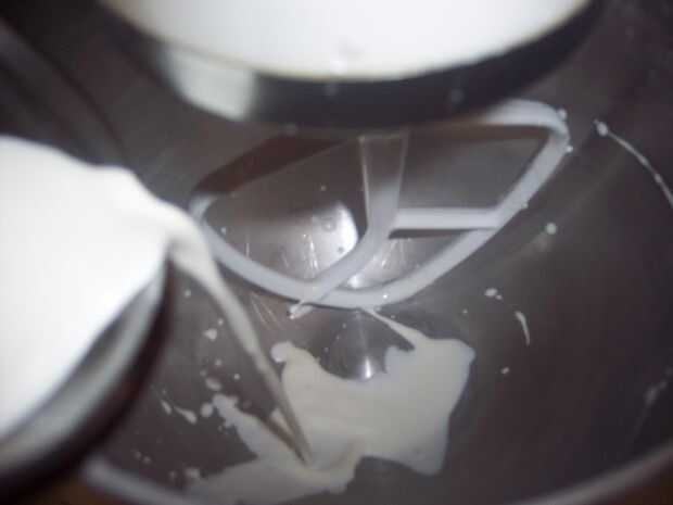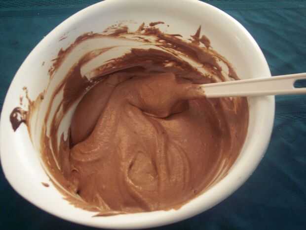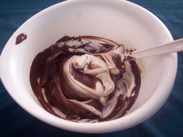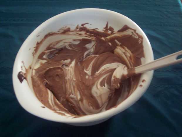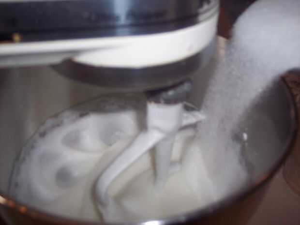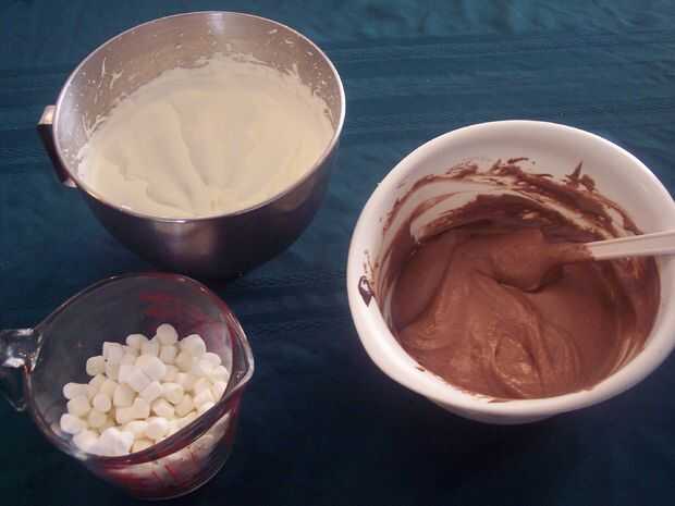 2. Lave y seque las aspas. Utilizando un medio frío tamaño recipiente y batidores refrigerados (si tienes dos cuencos de tamaño medianos y dos aspas entonces puede relajarse un conjunto mientras se hace el paso de la clara de huevo), batir la crema pesada o azotes con batidora eléctrica hasta dura, pero no granulada. Doble de la crema batida en el mezclador de chocolate hasta combinado uniformemente. Doblar todos los malvaviscos en la mezcla de chocolate.