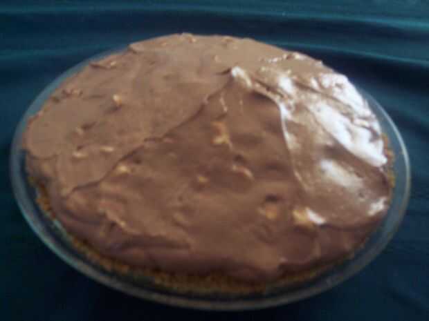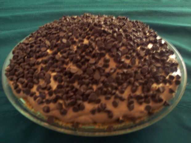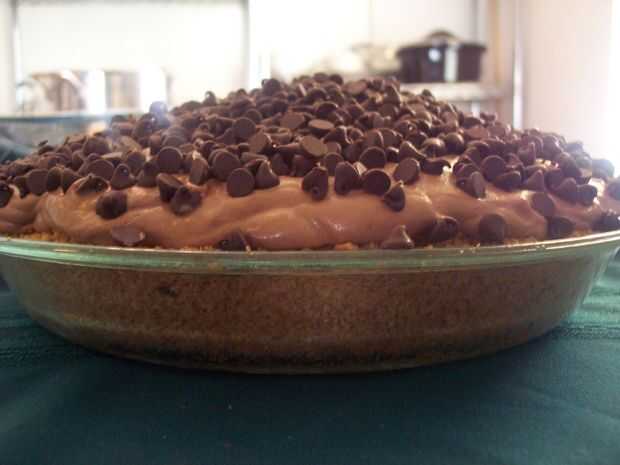 camellón lo más posible cerca del centro. Alisar la parte superior con una espátula de goma o cuchara, luego Espolvoree el 3/4 de taza de chispas de chocolate sobre la superficie de la tarta. Cubrir holgadamente con papel de aluminio carpas y refrigere durante al menos 6 horas o toda la noche. (