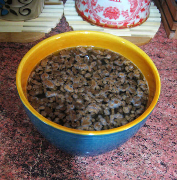 Poner las tazas de 1 1/2 de carne de soya en el recipiente y llenarlo con agua. Esto le ayudará a hacer la carne de soja más suaves y más fáciles de cocinar. No te preocupes, más adelante te quitamos el agua.