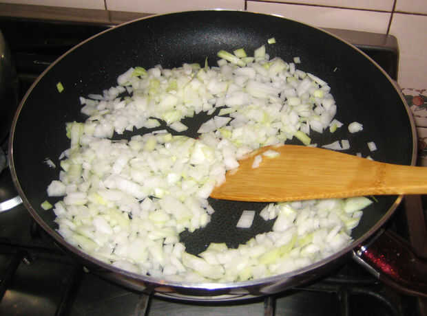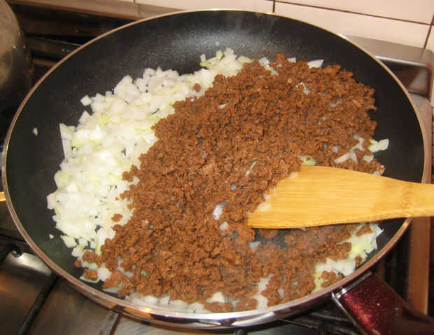 Una vez que las cebollas empiezan a dorarse, añadir la carne de soja. Revuelva todo junto un poco más de aceite, sal y pimienta (ADVERTENCIA: carne de soya le gusta absorber el aceite de oliva, así que está bien ser liberal con él).