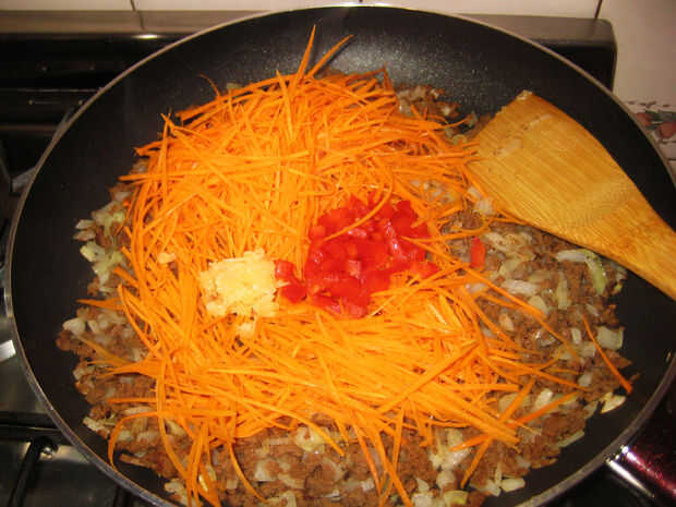 Cuando la carne de soya comienza como carne molida dorada añade el resto de las verduras (pimiento, ajo, zanahoria). Añadir un poco más de aceite de oliva, sal y pimienta. Cocinar unos minutos más hasta que las zanahorias son agradables y suaves.