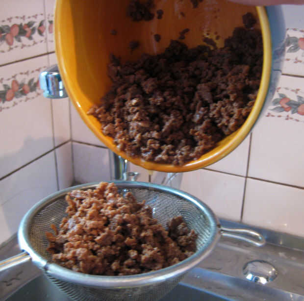 A continuación vamos a drenar el agua de la carne de soja. Encontrar utilizando un colador para el mejor método.