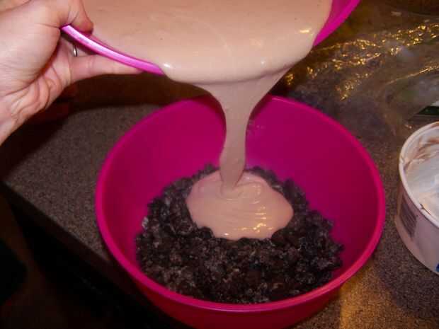 Vierta aproximadamente la mitad de la mezcla de pudín sobre las galletas machacadas previamente agregadas.