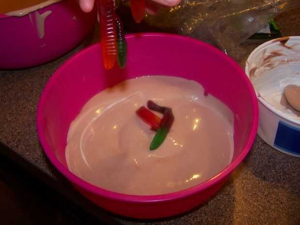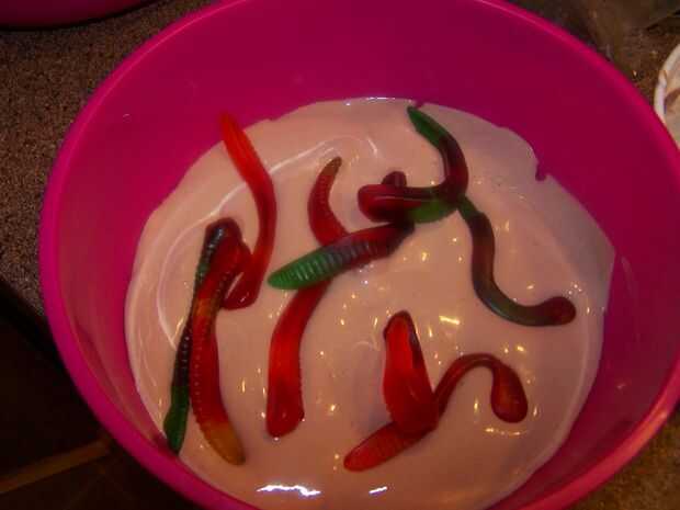 Basta con abrir una de las bolsas de gusanos gomosos. Puede agregar tantos como desees. Porque me encanta Gummy Worms, me adelanté y había añadido una bolsa entera. No te preocupes, todavía tenemos la segunda bolsa de gusanos para el siguiente pocas capas!