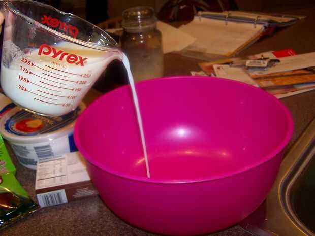 Cuando han medido exactamente 2 tazas de leche, vierta la leche en su tazón grande.