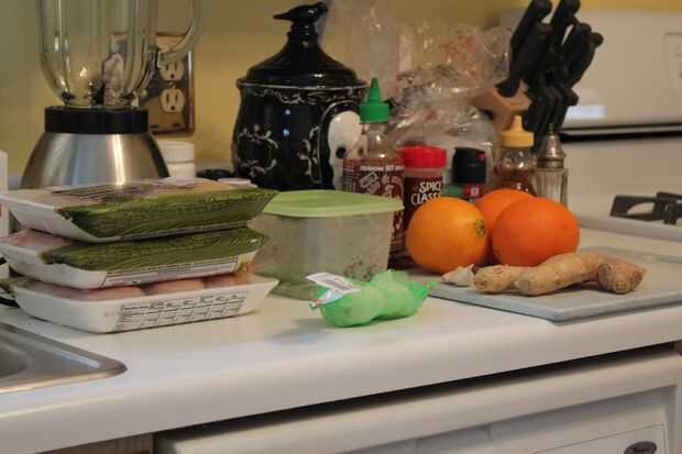 - ~ 1 lb de pechuga de pollo (he encontrado que la proporción de 1 naranja 1 lb pecho funciona bien, puede sustituir a otras proteínas)