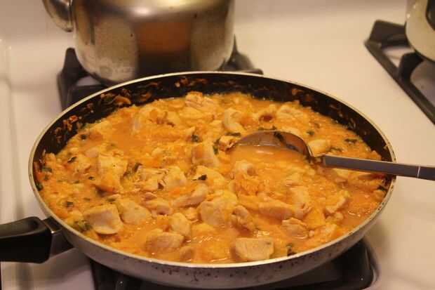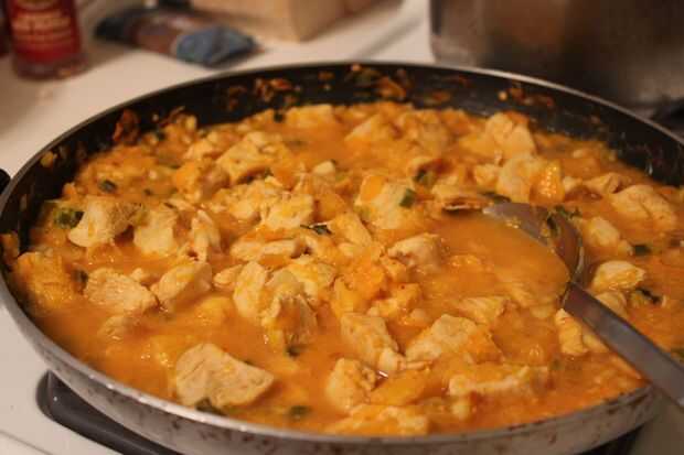 Establece inicialmente la estufa en alta hasta que los líquidos comiencen a hervir. Entonces, reduzca el calor a medio-bajo a medio. Cocinar durante unos 15-25 minutos revolviendo de vez en cuando hasta que todas las piezas de pollo cocidas. Cuanto más es guisada para, el más tierno el pollo.