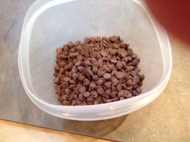 Poner los chips de chocolate en el tazón microondas y microondas durante 1 minuto 30 segundos. Tome el tazón de microondas y revolver con la cuchara. Coloque el tazón de fuente nuevo en microondas durante 15 segundos. Sacar el bol y revuelva otra vez. Repetir este proceso hasta que todos los chips de chocolate se derritan. Una vez derretido, tomar tazón de microondas y cuchara derretido chocolate en taza con espátula.