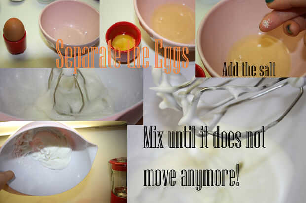 Separar los huevos, poner el huevo blanco en un tazón. Añadir la sal y mezclar hasta muy blanco y esponjoso. Para averiguar si has mezclado lo suficiente, el bol para mezclar y si se mueve el huevo. Si no se mueve, eres bueno para ir!