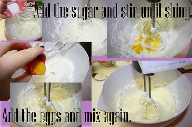 Poner el azúcar y mezclar nuevamente hasta que sedoso y brillante, como se muestra en la imagen. Añadir los huevos así y mezclar otra vez.