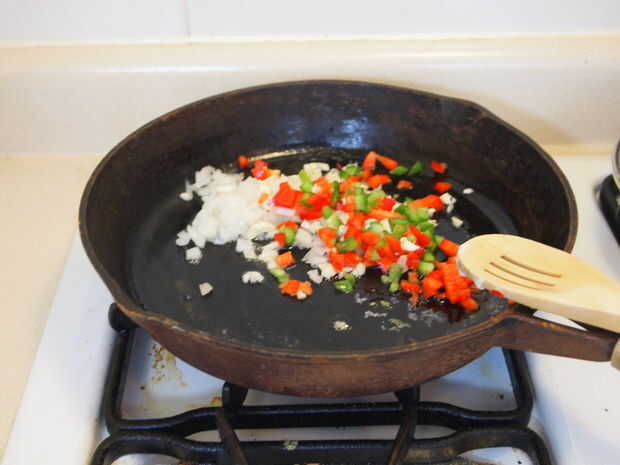 Ahora necesitarás una sartén y querrá ajustar la temperatura en la estufa a fuego medio. Justo antes de añadir las verduras, usted querrá tirar en una pestaña de mantequilla y un poco de aceite de oliva - sólo para cubrir el fondo de la olla. Luego, tiro en la cebolla, los trozos pequeños de pimientos en rodajas y el ajo. Dejar cocine por unos minutos y ablandar un poco.