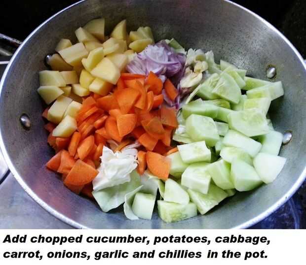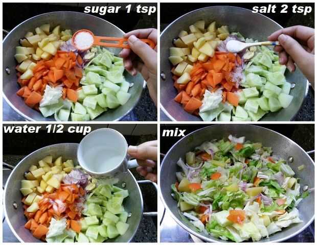 Añadir 1 cucharadita de azúcar, 2 cucharaditas de sal y media taza de agua a las verduras y mezclar bien.