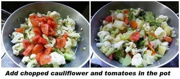 Añadir la coliflor picada y los tomates en la olla con el resto de las verduras y mezclar juntos. Mezclar con cuidado, trate de no romper la coliflor cortada en trozos pequeños.