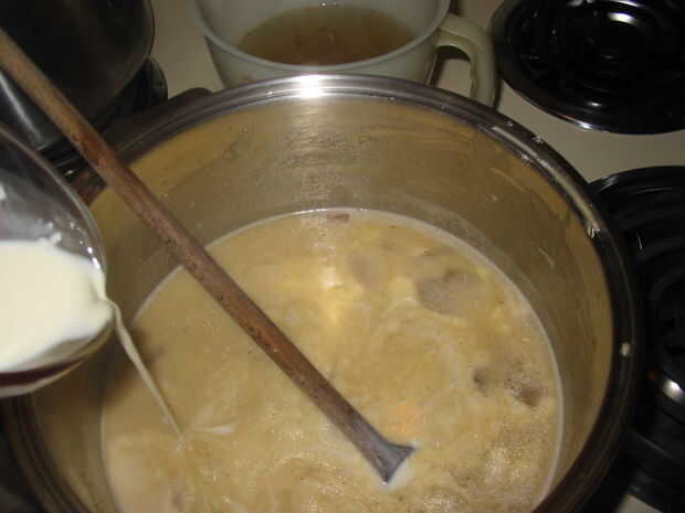 Esta es una receta francesa para hacer una salsa Veloute que puede ser utilizada como un relleno haciendo empanadas y otros platos. Los sabores pueden variar y se puede utilizar cualquier blanco caldo de cocción. Los trabajos de salsa con caldo de po