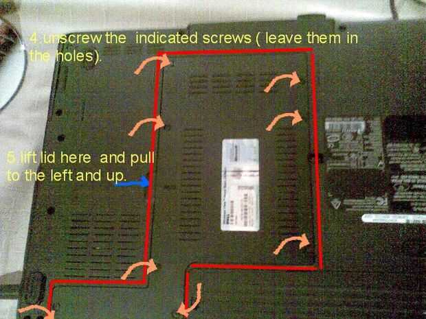4.) este es el panel que desea retirar en este modelo de Dell inspiron, afloje los tornillos marcados y dejarlos en sus agujeros, parece que queda bastante bien.