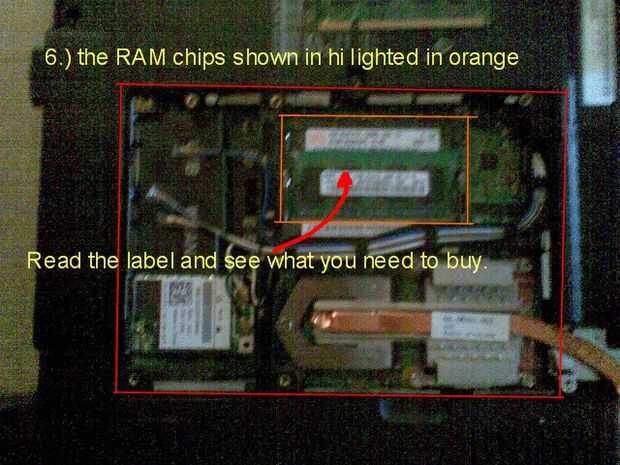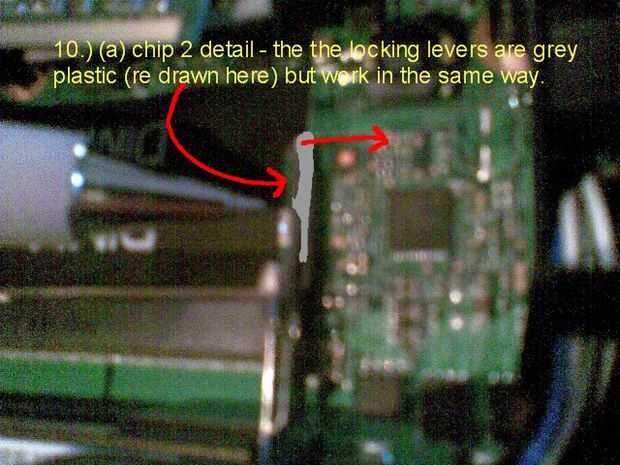 7.) se notará a ambos lados del chip superior a trozos de clips metálicos, (véase alto iluminado por las líneas naranja) el dedo consejos sobre la masa le puede ver en la parte superior del clip y presionar al mismo tiempo aparte.
