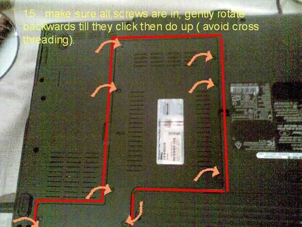 15.) lugar plano y girar los tornillos suavemente uno o dos vuelve salas hasta que no les haga clic (para enhebrado cruzado) y luego a les la manera correcta para arriba apretado.