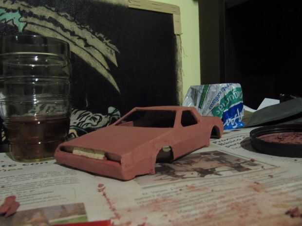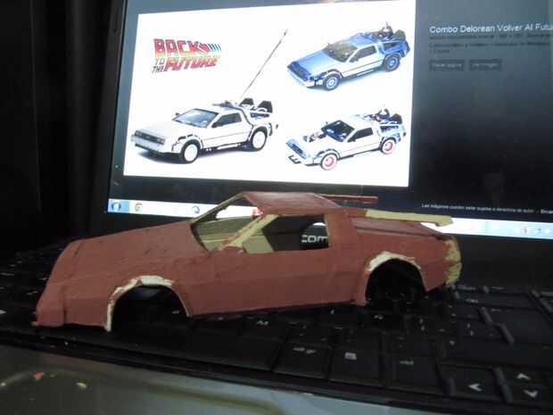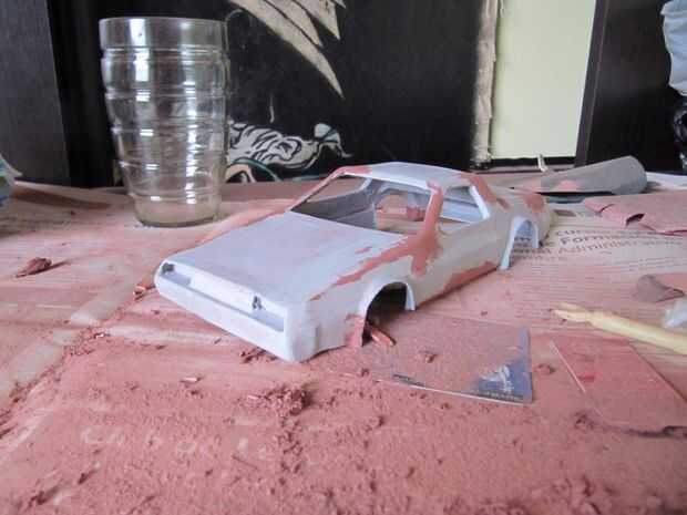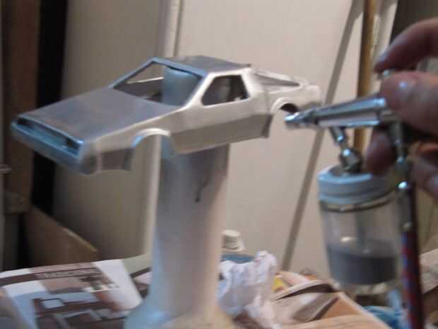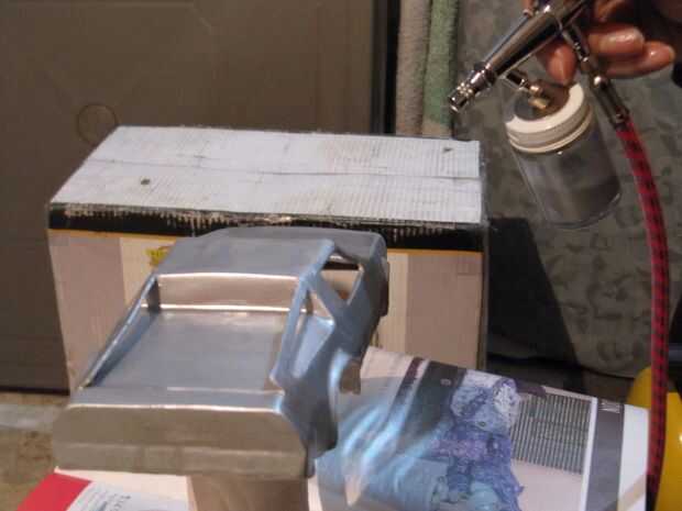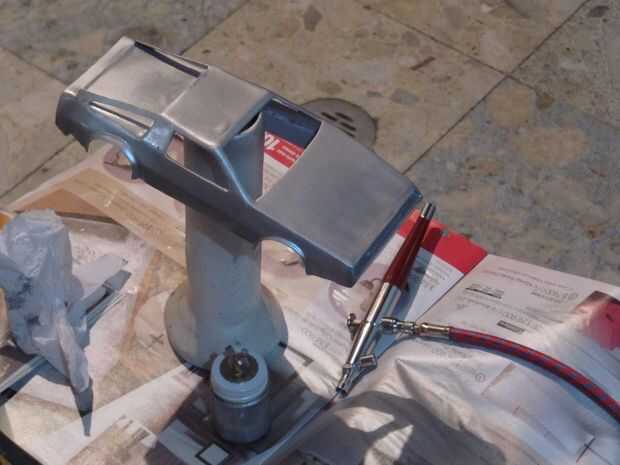 Separó un poco de masilla en el cuerpo de cartón con tarjeta de crédito, cuando se seca, pasé mucho tiempo lijado, repetí tres veces o más, cuando era totalmente liso, pintado blanco y luego, he pintado con un aerógrafo y pintura acrílica plata