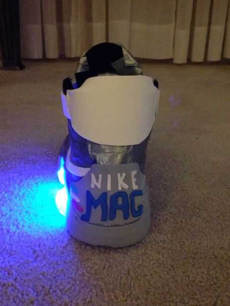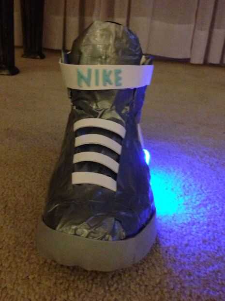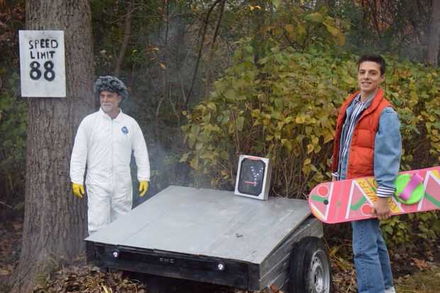 Para conseguir el Delorean parezca más convincente, poner de nuevo a los futuros puntales alrededor de él. Como el condensador de flujo que hice de una caja de cartón y LEDs. Luego hice revistas aire de zapatos viejos y espuma y pato cinta. También pongo mi tabla de flotar por el coche y una señal en el árbol que dice 88 de límite de velocidad.