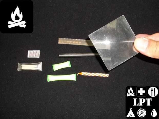 El Kit de supervivencia contiene los siguientes elementos que le permitirán comenzar un fuego en casi todas las condiciones: