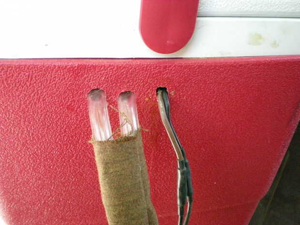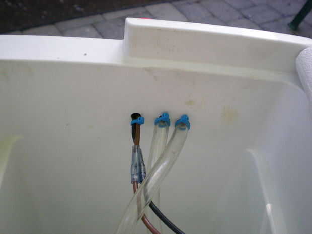 Conecte los cables a los cables de la bomba de achique fuera el pecho de hielo. Las bombas del modelo de regla no son polarizadas, pero si lo tuyo es conectan correctamente! Si usted quiere poner un interruptor en línea, adelante. También puede cablear a caja de fusibles de tu coche con una desconexión.