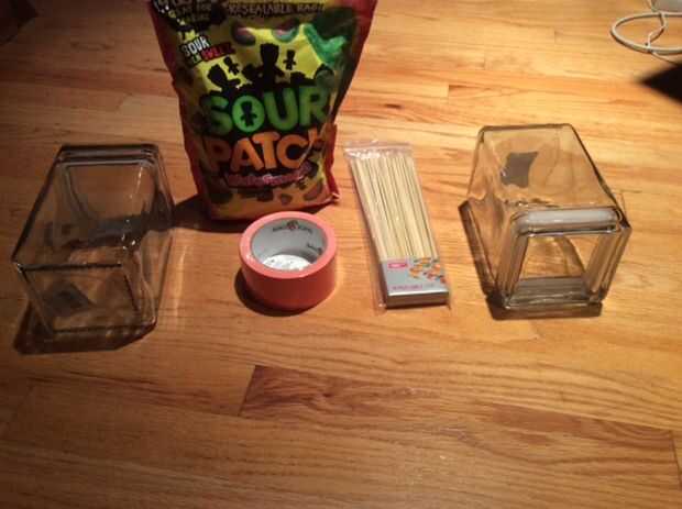 Vas a querer conseguir todos tus materiales listos antes de empezar a construir esta demo de onda. He creado una buena lista partida que puede rama fuera de si quiere añadir algo que no utilizo. Los cuatro materiales más importantes que usted necesita son: cinta adhesiva, palitos de brocheta, pesos pequeños a ser pegado a los palos el extremo de la brocheta, y dos grandes bases para sostenerlo para arriba. Para mi pequeña pesos he decidido utilizar los niños parche amargo: sandía. Sentí que eran muy fáciles de colocar al final de los palos de brocheta y un buen tamaño para ver esta demo. Para las dos bases usé tarros grandes.