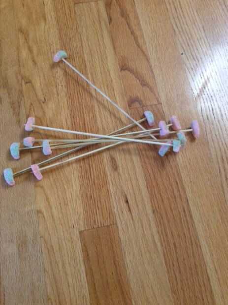 Luego tienes que pegar todos tus pesos pequeños, mi sour patch kids, a ambos extremos de cada palo de brocheta. Yo diría que un buen número es alrededor de 20-30 palillos de brocheta por lo que tendrá peso pequeño de 40-60. Estos niños parche amargo actuará como las partículas de la onda moviéndose arriba y abajo. Es muy importante que tenga en cuenta que pesa debe colocarse uniformemente a ambos lados para nuestra onda no se incline hacia un lado muy pesadamente.