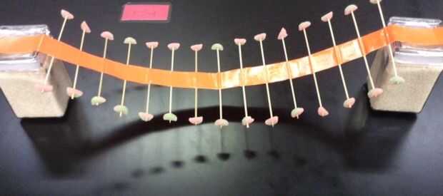 Una vez que haya terminado de asegurar todos los palillos de brocheta en medio de las dos piezas de cinta es tiempo para unir todo eso a las dos bases. Te recomiendo haciendo una pieza muy larga de la cinta que se forma al final de una base completamente a través de los otros dos al final de la segunda base. Usando sólo una pieza de cinta hará que sea mucho más probable que se caiga y estancia conectada a la base. También es muy importante poner el largo pieza exactamente de los dos pedazos más cortos porque desea que mantenerse conectado en todas partes o podría arruinar la onda. Como se puede ver en la foto he decidido llenar mis jarras (bases) con arroz así que son más pesados y mucho más difícil deslizar más cerca uno al otro cuando se crea tensión en la cinta para crear la onda.