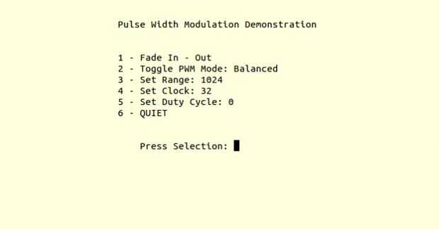 2 - Alternar modo PWM - pwmSetMode([PWM_MODE]) allí son dos modos posibles de PWM_MODE_BAL y PWM_MODE_MS. PWM_MODE_MS es el modo tradicional de PWM marca: espacio, pero el modo equilibrado, PWM_MODE_BAL, es el modo predeterminado PWM en el RaspberryPi.