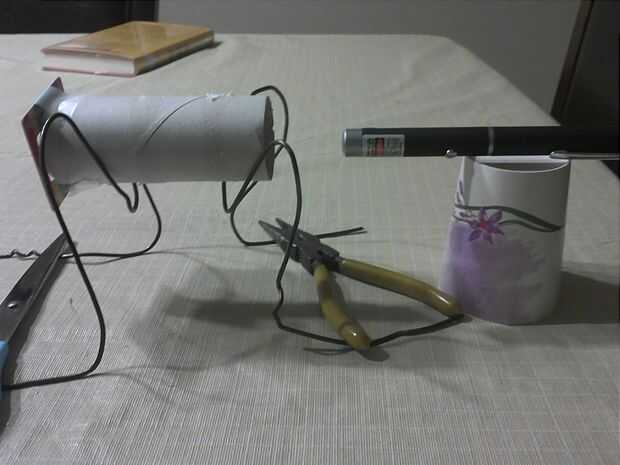 Ahora toma el puntero láser y montarlo en un vaso de plástico con cinta adhesiva por lo que directamente pasa por el extremo abierto del tubo y golpea el centro de la rejilla de difracción.