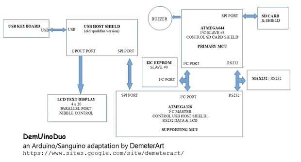 El problema principal con esta "actualización" es el sacrificio de enormes recursos en código flash y RAM demanda ya sea estática o dinámica. Sin embargo, el uso de un sistema de procesador dual alivia el dolor de la pérdida horrible y proporciona a una especie de sentimiento vale la pena el esfuerzo cuando el proyecto llega a un resultado tangible utilizable. El sistema se puede construir con ambos procesadores siendo algo atmega328s, que reproduce toda la funcionalidad de DemUino versión 1.66 pero con sólo un poco más de 700 bytes de RAM libre. El uso de un atmega644 como el principal procesador de manejo de la tarjeta SD y la delegación de puerto USB, master I2C y RS232 (PC data) a un atmega328 construye un sistema más capaz mejor con más de 1300 bytes libres para DemUinoDuo versión 1.0 incluyendo SD FAT funcionalidad. La pantalla es un texto estándar de 4 x 20 LCD (modo paralelo) impulsado por el puerto GPOUT del regulador de máxima en el escudo de host USB.
