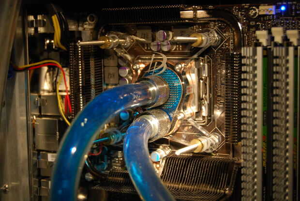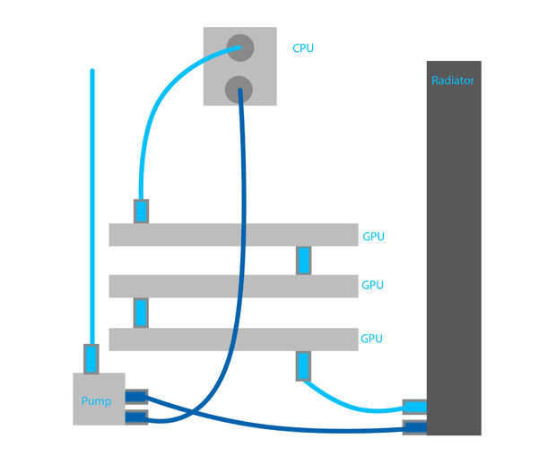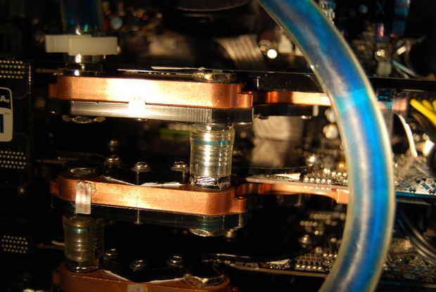 A continuación fije el tubo de la parte superior del bloque de agua de CPU para la primera tarjeta gráfica.