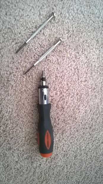 Dos destornilladores más pequeños (los que cabrían cómodamente en los orificios)