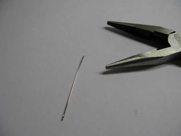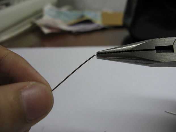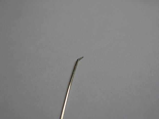 Haz tus pinzas y doble lentamente la aguja en un ángulo de 45 grados. Asegúrate de doblar poco a poco o de lo contrario la aguja podría romperse, las agujas se rompen fácilmente.