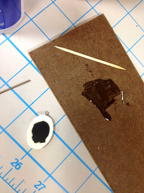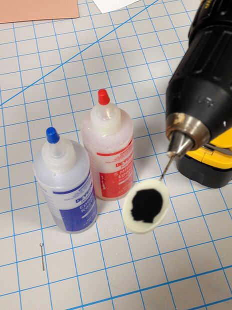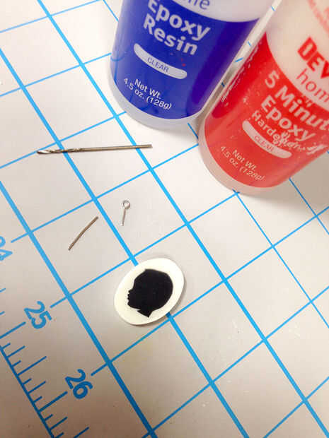 3/32 broca de un taladro o una Dremel y perfore un orificio en la parte superior de la botonera para recibir los pernos de ojo. Tenga cuidado de usted es de perforación hacia abajo o usted podría venir a través de la parte frontal de su diseño. Regla: perforar la capa blanca solamente. Mezclar un pequeño empujón de epoxy más algunos en el orificio con un palillo de dientes o el perno del ojo. Luego pegar el perno de ojo en y asegúrese de que el ojo va en la dirección correcta.