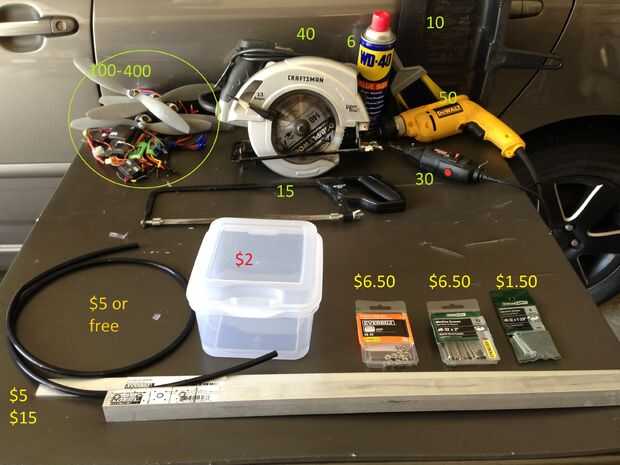 - Barra de aluminio 1" C o 1" cuadrado tubo (C necesaria pero sólo tenía tubo cuadrado) - 4" longitud (soportes del motor)