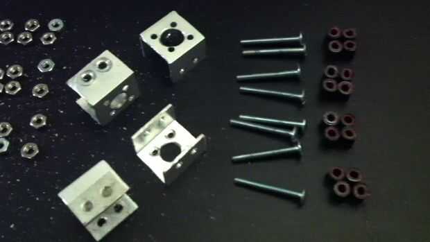 Cortar 4 1" cubos largo, utilice el montaje del motor suministrado por el motor Manufacturing en los montes y use el rotulador para marcar donde están los agujeros. Centro de perforación piloto y ellos entonces 7/64, entonces 9/64 y para el motor un poco más grande y achaflanar los bordes así su descarga. También hay una plantilla para su conveniencia.