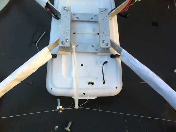El cable que ves alrededor puede ser cualquier alambre o hilo resistente sostiene los brazos rígidos durante fuerza hacia los lados. Agrega rigidez sin mucho peso extra. Alrededor de la secuencia a través de los orificios en el extremo de los brazos y luego un nudo buena, mientras que tiene tensión. Si usted necesita más tensión que puede agregar que un zip o los amarres a la estructura como se muestra en la imagen, luego apriete para lograr la tensión necesaria.